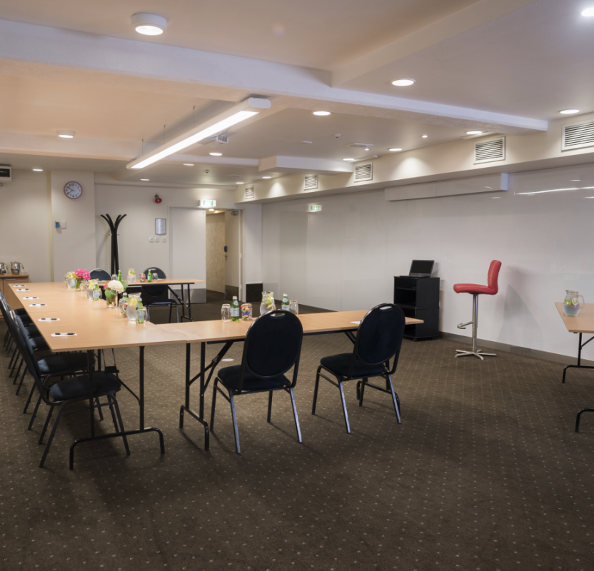 A great workshop/think tank room displaying a whiteboard wall, funky presenter stools and an installed data projector. This room is located on the first level of the hotel and interconnects with meeting room one.